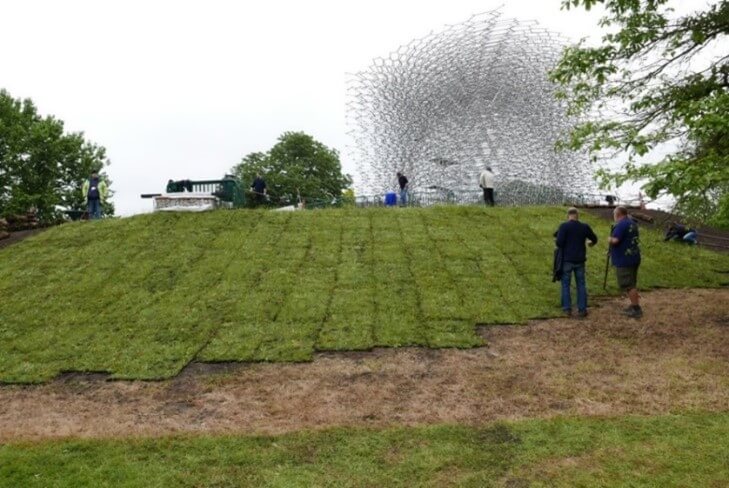 Today, this contemporary piece of art has become one of the most unique and photographed spots at Kew Gardens. Wildflower Turf Ltd grew and supplied Wildflower Turf® that surrounds the installation. Working closely alongside Tony Kirkham, Head of Arboretum and Horticultural Services at Kew, and other members of the Kew team, Wildflower Turf Ltd supplied 2,270m² of Wildflower Tur® to the Hive at Kew Gardens. Winning a Landscape Institute Award for its immersive impact in 2016, the Hive continues to stand tall as a striking symbol of the challenges facing bees today.